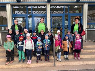 Unsere Vorschulkinder mit ihren Erzieherinnen vor der Christiane-Vulpius- Grundschule