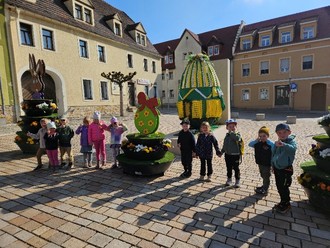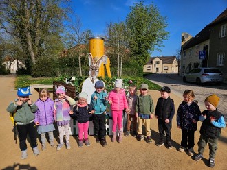 Um die Wartezeit etwas zu verkürzen, haben sich die Kinder und die Erzieherinnen der Fische-Gruppe auf die Suche nach dem Osterhasen gemacht, erst in der KiTa, dann im herrlich blühenden Kurpark, auf dem liebevoll herausgeputzten Markt und schließlich bekamen wir einen Tipp: „Der Osterhase hält sich des Öfteren hinter der Goethe-Schule auf, da ist alles so schön für Ostern geschmückt, gleich am Brunnen, da müsst ihr mal schauen...“ Gesagt, getan.