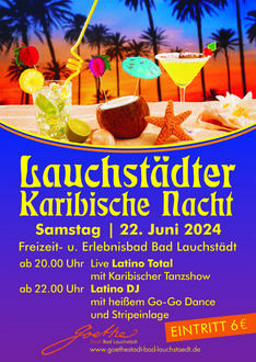 Am Samstag, den 22. Juni 2024 findet ab 20:00 Uhr wieder die Lauchstädter Karibische Nacht im Freibad statt. WIR würden uns freuen, SIE begrüßen zu können.