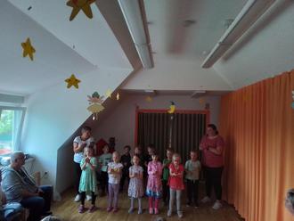 Am 30. Mai 2024 veranstalteten die Kinder der roten Gruppe einen Oma-Opa-Tag. Sie übten dazu fleißig ein kleines Programm ein und bastelten Geschenke. Alle Kinder waren sehr aufgeregt, ob auch wirklich die Oma oder der Opa kommt.