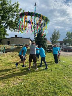 Vor dem Aufstellen des Maibaumes durften die Kinder den Baum mit bunten Girlanden selber schmücken. Den Kindern hat dies viel Freude bereitet.