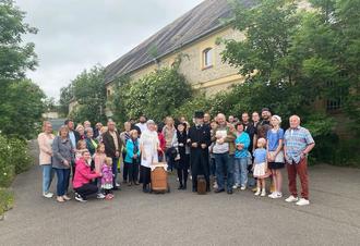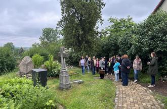 Gruppenbild der Dorfrundgänger mit den historischen Persönlichkeiten
