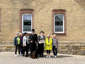 Diese Idee aufnehmend, hatte der Heimatverein am 25. Mai zu einem Spaziergang auf den Spuren der Chronik eingeladen. Über das große Interesse waren die Organisatoren dann doch etwas überrascht und natürlich sehr erfreut. Über 40 Delitzerinnen und Delitzer aller Altersgruppen hatten sich auf dem ehemaligen Rittergut eingefunden. Nicht schlecht staunten sie, als die ehemaligen Besitzer des Gutes „Herr und Frau von Zimmermann“, um die Ecke spazierten. Ein Kurzschluss im Benkendorfer Schloss im Jahre 1924 hatte die beiden 100 Jahre in die Neuzeit „gebeamt“. Irritiert von den großen schnellen Karossen und wundersam gekleideten Menschen, waren sie sehr froh, als sie unter den Wartenden ihre „Magd Berta, den Wirt Max und zwei Dorfkinder“ erkannten.