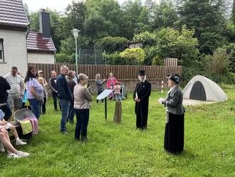 Am Katerborn, der Quelle des Dorfes, versuchten die zwei jungen „Wasch-Mägde“ Charlotte und Mia leider vergeblich, ihre Wäsche zu waschen. Aber dafür kannten sie die beiden möglichen Erklärungen, wie die Quelle zu ihrem Namen gekommen ist. Einige „Ur“-Delitzerinnen konnten sich auch noch daran erinnern, wie mühselig es war, das Brunnenwasser aufgrund der fehlenden Trinkwasserleitung bis in die heimische Stube zu tragen. Über die Kurt-Kittelmann-Straße und die Freiheitsstraße ging es dann schließlich in die Bauernsiedlung, wo der Wirt schon mit gegrillten Würstchen und erfrischenden Getränken auf die Spaziergänger wartete.