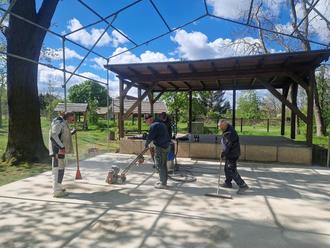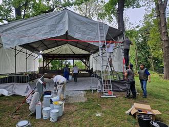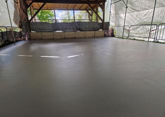 Am 26.04.2024 wurde die Grundierung aufgetragen und mit Absperrungen vor unbefugtem Betreten durch Menschen und Tiere gesichert. Der Bauhof der Goethestadt Bad Lauchstädt unterstützte hier mit Absperrgittern. Eine weitere Arbeit war dann das Absanden der Tanzfläche am 30.04.2024. Aufgrund der Wetterverschlechterung wurde die Tanzfläche komplett eingehüllt. Am 04.05.2024 wurde dann der Boden geschliffen und im Anschluss die Beschichtung aufgetragen. Neben dem professionellen Material und Werkzeugen kamen auch Material und Werkzeuge der freiwilligen Helfer zum Einsatz. Nach dem Abtrocknen konnte die sanierte Tanzfläche betreten und ausprobiert werden. Alle Anwesenden waren sich einig: Die Tanzfläche ist super geworden und kann zum anstehenden Pfingstfest eingeweiht werden.