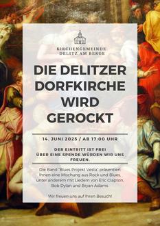 Am 14. Juni 2025 lädt die Kirchengemeinde Delitz am Berge zum Rockkonzert ein. Ab 17:00 Uhr spielt die Band Blues Projekt Vesta eine Mischung aus Rock und Blues, unter anderem mit Liedern von Eric Clapton, Bob Dylan und Bryan Adams.