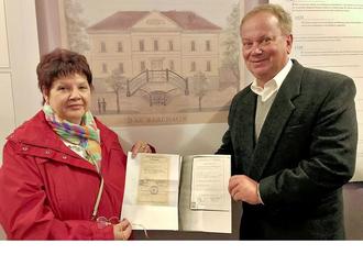 Barbara Rödel und Frank Czekalla präsentieren ihre Geburtsurkunden zum 200. Jubiläum des Badehauses