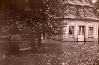 Historische Gebäude im Kurpark stehen im Jahr 1965 inmitten des Hochwassers