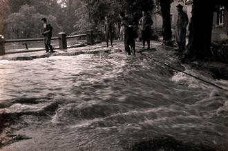 Wassermassen strömen während des Hochwassers im Jahr 1965 aus dem Teich im Kurpark