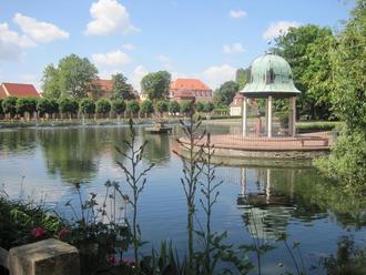 Blick über den Kurparkteich zu den historischen Gebäuden