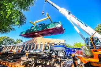 Die Grubenlok wird auf das Gleis an der Pfännerhall gehoben