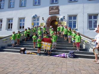 Die Schulanfänger präsentieren sich auf der großen Eingangstreppe
