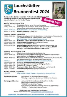 Am kommenden Wochenende 16. bis 18. August 2024 wird das Brunnenfest im neuen Gewand stattfinden. Ausrichter des Lauchstädter Brunnenfestes 2024 sind die Goethestadt Bad Lauchstädt und die Historische Kuranlagen und Goethe-Theater Bad Lauchstädt GmbH.