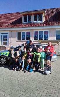Auch der sichere Weg zur Schule wurde gemeinsam mit den Kindern besprochen. Highlight bildete dann das Untersuchen des Polizeiautos. Alle Kinder durften sich einmal in das Auto setzen, in den Kofferraum schauen und sogar die schwere Schutzweste überziehen. Zum Schluss wurde dieser aufregende Besuch mit einem gemeinsamen Foto festgehalten.