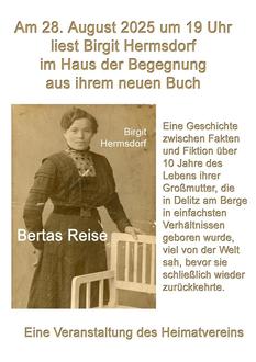 Der Heimatverein veranstaltet am 28.August 2025 eine Lesung. Ab 19:00 Uhr liest Frau Birgit Hermsdorf aus ihrem neuen Buch vor.