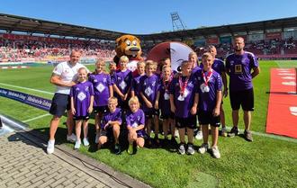 Kurze Zeit später war es dann so weit. Die Kinder wurden abgeholt und liefen mit den Mannschaften auf das Spielfeld auf. Danach schauten sie sich das Punktspiel an und es gab auch noch Autogramme und Fotos von den Spielern, ehe ein erlebnisreicher Tag zu Ende ging und der Heimweg angetreten wurde.