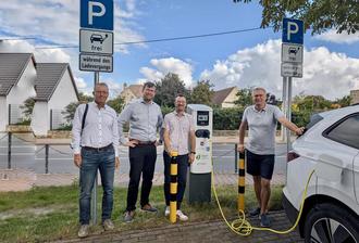 Parkplatz Schützenhaus / Turnhalle laden, denn dort wurde vor Kurzem eine moderne Ladesäule in Betrieb genommen. Gemeinsam eröffneten Bürgermeister Christian Runkel, Bauamtsleiter Oliver Thieme, Klimaschutzmanager Horst Sprenger sowie Carsten Blütgen von den Stadtwerken Merseburg die neue Infrastruktur.