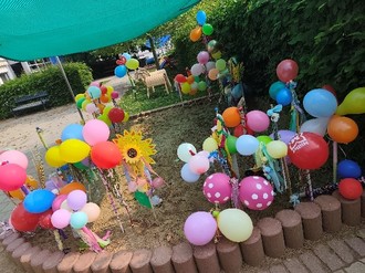 Unser absoluter Höhepunkt war am Freitag, den 29. August 2025 das große Kita-Fest. Eingeladen waren alle Familien und Freunde unserer jetzigen und ehemaligen Kita-Kinder. Besorgt schauten wir am Vormittag zum Himmel, denn obwohl die Natur den Regen so sehr brauchte, wir hofften auf Sonnenschein und unser Bitten wurde erhört; pünktlich um 12:00 Uhr konnten wir unsere Freifläche liebevoll-herbstlich schmücken und alle Stationen aufbauen.