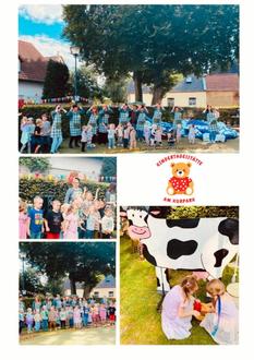 Es gab Traktoren zum Anfassen und Erntehelfermaschinen zu Bestaunen. Die Kuh „Berta“ wurde gemolken, Äpfel geschnappt und wie in alten Zeiten mit dem Kinderdreschflegel das Getreide bearbeitet. Es war toll zu erleben, wie super unsere Kinder ihr eingeübtes Programm vor den zahlreichen Gästen präsentierten und mit wie viel Freude und Wohlwollen dieses Fest gegangen wurde. Deshalb möchten wir uns an dieser Stelle von ganzem Herzen bedanken.