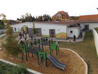 Blick über die Außenanlagen des Kindergartenbereiches mit seinen modernen Spielgeräten