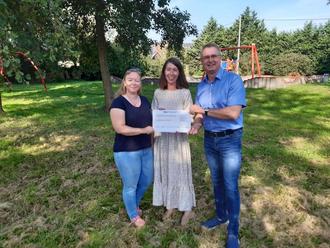 Scheckübergabe durch Frau Clausnitzer (Mitte) an Bürgermeister Christian Runkel und Anne Teichmann auf dem Milzauer Spielplatz