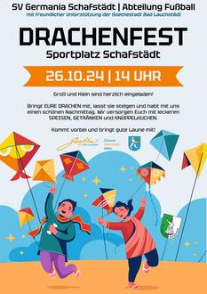 Zu einem Herbst gehört auch Drachensteigen. Am Samstag, den 26. Oktober 2024, ab 14:00 Uhr ist es wieder soweit zahlreiche bunte, große und kleine Drachen werden am Himmel über dem Gelände des Schafstädter Sportplatzes zu sehen sein. Wie in den Jahren zuvor soll es wieder ein Tag für Groß und Klein werden. Für Speis und Trank wird gesorgt. Wir freuen uns über Eure Teilnahme und wünschen viel Spaß.