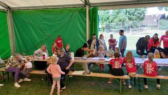 Natürlich stellt sich beim Toben und der Bewegung an der frischen Luft richtig großer Hunger ein. Die Würstchen und Grilltaler schmeckten allen und der mit viel Liebe gebackene Kuchen wurde bis zum letzten Krümel aufgegessen. Erstmalig gab es in diesem Jahr Popcorn, das natürlich immer seine Abnehmer findet.