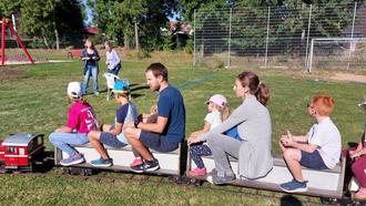 Große und kleine Leute drehen eine Runde mit der Eisenbahn