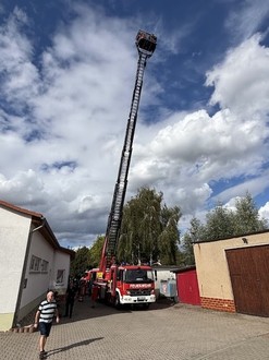 Ein besonderes Highlight am Nachmittag war die große Fahrzeugausstellung. Neben den Einsatzfahrzeugen der eigenen Wehr zogen vor allem die Drehleiter der Kameraden aus Querfurt sowie das neue HLF 10 der Freiwilligen Feuerwehr Schafstädt die Aufmerksamkeit auf sich. Für Schmunzeln sorgte eine kleine Panne: Aufgrund eines technischen Defekts musste unser Stadtwehrleiter die Leiter kurzerhand zu Fuß wieder hinabklettern – was er mit Humor und Applaus des Publikums meisterte.