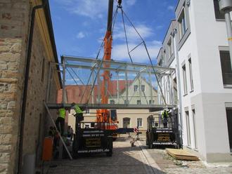 Die neue Glasbrücke zwischen den beiden Rathäusern in Bad Lauchstädt wird mit Krantechnik eingesetzt