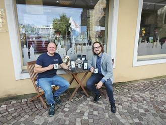 Kaffeeröster Jens Keller und Merseburgs Oberbürgermeister Sebastian Müller- Bahr probieren die neukreierte Kaffeesorte Rabenschwarz vor der Touristeninformation