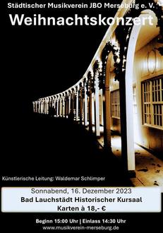 Traditionell werden wir am Sonnabend, dem 16.12.2023 um 15:00 Uhr (Einlass: 14:30 Uhr) im Historischen Kursaal in der Goethestadt Bad Lauchstädt unser alljährliches Weihnachtskonzert durchführen. Die künstlerische Leitung hat Waldemar Schlimper. Der Eintritt kostet: 18,00 Euro.