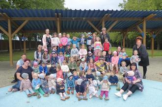 Gruppenfoto auf dem Freibadgelände zum Picknick-Ausflug