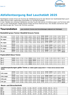 In den Tabellen der einzelnen Abfallarten sind die Touren des Jahres mit Abkürzungen und Terminen definiert. In der fortlaufenden Tabelle danach finden Sie ihren Wohnort bzw. ihre Straße und können über die Abkürzungen der Touren die Termine zuordnen.