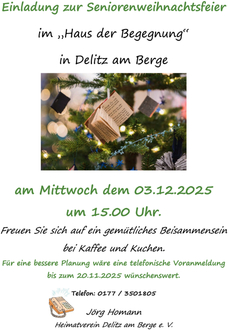 Am Mittwoch, dem 3. Dezember 2025, lädt der Heimatverein Delitz am Berge e.V. herzlich zur Seniorenweihnachtsfeier in das Haus der Begegnung ein. Ab 15:00 Uhr erwartet unsere Gäste ein gemütliches Beisammensein bei Kaffee und Kuchen sowie eine besinnliche Vorweihnachtsstimmung.