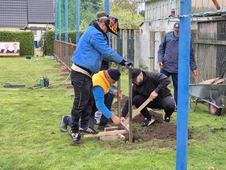 Die neue Bandenhaltung am Südflügel des Sportplatzes wird montiert