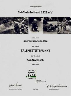 Der Skiclub Sohland 1928 e.V. freut sich sehr über die erneute Auszeichnung als Talentstützpunkt in der Nordischen Kombination für den Förderzeitraum 2025/2026. Diese Würdigung verstehen wir als Dank und Anerkennung für unsere professionelle und kontinuierliche Vereinsarbeit.