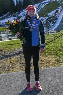 Aber was schenkt man einer so super Athletin? Die Saison ist vorbei und Günther Rößler, unser ehemaliger Vereinsvorsitzender, bestellte kurzerhand bei der Sohlander Trotzmühle eine Vizeweltmeister-Torte für Jenny. Jenny teilte diese mit 30 Nachwuchssportler/innen und den ÜL/innen in Sohland! Sie hatte auch die Medaille aus Planica mitgebracht und alle durften sie sehen, anfassen und einige probierten diese auch gleich mal an. Jenny beantwortete die Fragen und hörte auch den Kleinsten geduldig zu. Als Jenny die Schanzenbaude verließ, hatten sich alle noch einmal aufgestellt, um sich mit einem Blumengruß zu verabschieden. Wir haben uns sehr über diesen Besuch gefreut!