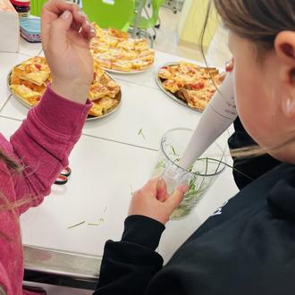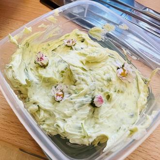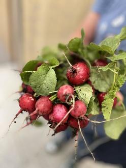Zum gesunden Frühstück am 16.05.25 gab es Radieschen aus eigenem Anbau dazu. Zum anschließenden Verzehr stellten die Kinder frische Kräuterbutter her.