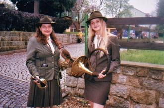 „Anblasen“ der Trophäenschau, hier mit Jagdfalken (li), Schülerinnen der Forstschule Šluknov