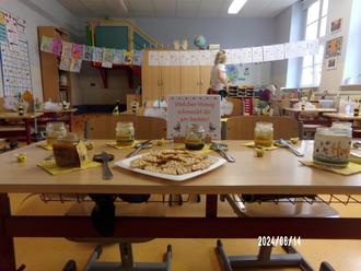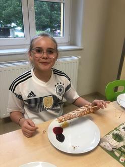 Welche kulinarischen Köstlichkeiten mit Honig zubereitet werden können, konnten viele Schüler ausprobieren. Die Klasse 4b hat zum Beispiel mit Frau Arnold aus der „Kleenen Schänke“ Honigwaffeln gebacken. Auf dem Foto ist Marie zu sehen, die bereits mit ihrem zubereiteten schwarz, rot, goldenen Dips und passendem Fußballtrikot der Nationalmannschaft die Fußball-EM einläutet.