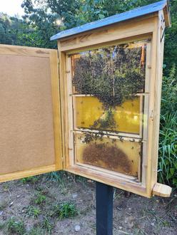 Ein Höhepunkt war auch die neue Schaubeute, mithilfe derer die Kinder nun das Leben in einem Bienenstock jederzeit beobachten können. Für die Materialien und das Aufstellen danken wir an dieser Stelle herzlich Familie Paulick/ empel, der Firma Bartke und dem Bauhof.