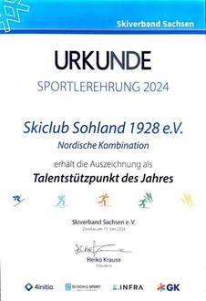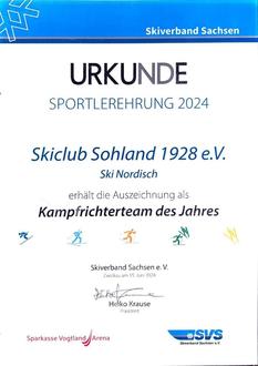 Die Kampfrichter des Skiclub Sohland wurden zum "Kampfrichter-Team 2024" ernannt! Zudem wurde der Skiclub Sohland 1928 e.V. als Talentestützpunkt des Jahres 2024 in der Nordischen Kombination ausgezeichnet. Beide Auszeichnungen sind das Ergebnis einer großartigen Teamarbeit aller im Verein tätigen Mitglieder und Helfer. Die Unterstützung unserer Sponsoren ist dabei auch ein ganz wichtiger Bestandteil.