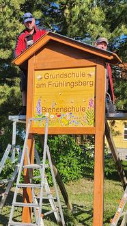 Voller Freude haben wir unser neues Eingangsschild im Mai am Eingang des Schulgeländes platzieren können. Wieder einmal haben die Firmen von Herrn Steffen Schirner und dem Dachdecker Herrn Gust kostenlos ein kleines, schickes Bauwerk hergestellt, das unsere Lehrerin Kathrin Briesovsky danach toll künstlerisch gestaltete.