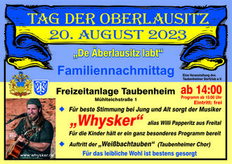 Der Musiker Whysker alias Willi Papperitz wird für beste Stimmung bei Alt und Jung sorgen. Für die Kinder hält er ein lustiges und buntes Programm bereit. Auch die Weißbachtauben werden uns mit ihren Liedern erfreuen. Ab 14:00 Uhr bieten wir Kaffee und selbst gebackenen Kuchen, Getränke und Speisen an.