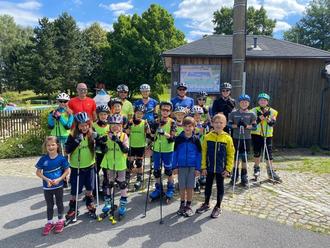 Am Freitag schnallten wir dann alle die Inliner an, um nicht nur an Kondition und Technik zu feilen. Über einige Umwege durch Wehrsdorf war unser Ziel das Wehrsdorfer Waldbad. Dort konnten wir den Beachvolleyballplatz nutzen, der Spielplatz wurde für Gleichgewichtsübungen und koordinative Übungen umfunktioniert, bevor dann fast alle ins kühle Nass eintauchten. Und das war nicht nur kühl, sondern richtig schön kalt. Nach einigen Bahnen flüchteten dann die Sportler/innen schnell in ihre trocknen Klamotten und in die Sonne. Per Inliner ging es dann wieder zurück ins Sparkassen-Skiareal.