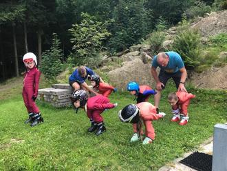 Am Samstag wurde nach dem Wecken und vor dem Frühstück schon fleißig gepackt. In Vorbereitung auf den anstehenden Sachsenpokal in Spitzkunnersdorf wurde das Training an die dortigen Forstenschanzen gelegt. Wir hatten die Schanzen ganz für uns und konnten wunderbar trainieren. Und Sport macht ja bekanntlich hungrig und so packten wir unser Picknick aus (ein Dank an Familie Hahnel & Rößler). Nach dem Essen wurde den Kindern mitgeteilt, dass die nächste Trainingseinheit ansteht und wir einmal die Sportart wechseln. Mit fragenden Gesichtern ging es dann in Richtung Oderwitz. Ski wurden gegen Schlitten getauscht. Auf der Sommerrodelbahn wurde dann noch einmal Fahrt aufgenommen, bevor es zurück nach Sohland ging. Ein Dank an die Eltern, die uns fahrtechnisch unterstützt haben. So schnell vergeht die Zeit, denn in Sohland hieß es dann Skimaterial aufräumen, Sachen packen und Zelte abbauen. Bevor bei dem gemeinsamen Grillen mit den Eltern das Trainingslager beendet wurde, gab es noch einen kleinen offiziellen Teil. Unsere Schuleintrittskinder erhielten noch ein kleines Geschenk und unser Jonas Wendland wurde aus der Trainingsgruppe verabschiedet. Er wird ab dem neuen Schuljahr an der Eliteschule des Sports in Oberwiesenthal trainieren. Dafür wünschen wir ihm alles Gute.
