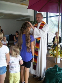 Während der Andacht zu Beginn unseres Festes segnete Kaplan Surek alle Kinder und Erwachsenen.