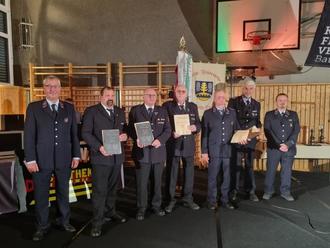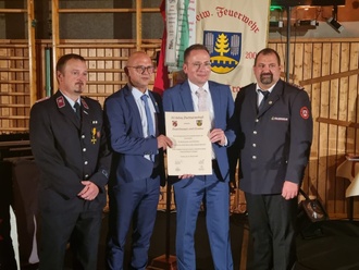 Hagen Zuber der Bürgermeister von Zuzenhausen und Carsten Vogt der Kommandant der Wehr Zuzenhausen Ehrten den Kameraden Jürgen Neumann mit dem Feuerwehrehrenkreuz in Silber, sowie die Kameraden Steffen Hollan und Sven Nostitz mit dem Feuerwehrehrenkreuz in Bronze, des Kreisfeuerwehrverbandes Rhein-Neckar für Ihre langjährigen Bemühungen um die Partnerschaftspflege.