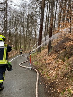 Neben unseren üblichen Löschmethoden hatten wir an diesem Tag freundliche Unterstützung durch die Firma „Iconos GmbH", welche uns Flächen,- bzw. Kreisregner zu Verfügung stellte. Einmal aufgestellt und eingerichtet lassen sich über diese große Waldflächen mit geringem Personalbedarf ablöschen und vor Wiederaufflammen schützen.